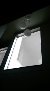 吹き抜け部分には大きい窓と吊り下げタイプの照明。